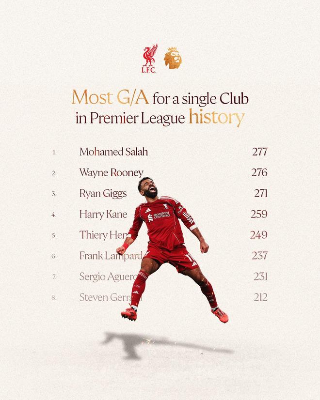 根据利物浦官方的统计,本场比赛的助攻让萨拉赫代表红军在英超联赛的直接参与进球数达到了277球(302场188球89助攻),他也就此打破了此前由鲁尼保持的纪录,成为了英超历史代表单一球队直接参与进球数最多的球员。